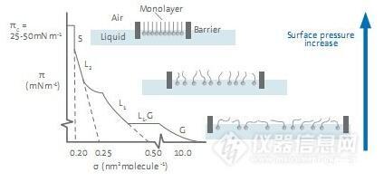在進行典型的等溫壓縮測試時,單分子層先從二維的氣相(G)轉變到液相(L)最后形成有序的固相(S)。在氣相中,分子間的相互作用力比較弱;當表面積減小,分子間的堆積更為緊密,并開始發生相互作用;在固相時,分子的堆積是有序的,導致表面壓迅速增大。當表面壓達到最大值即塌縮點后,單分子層的堆積不再可控。