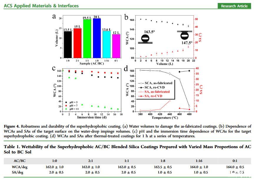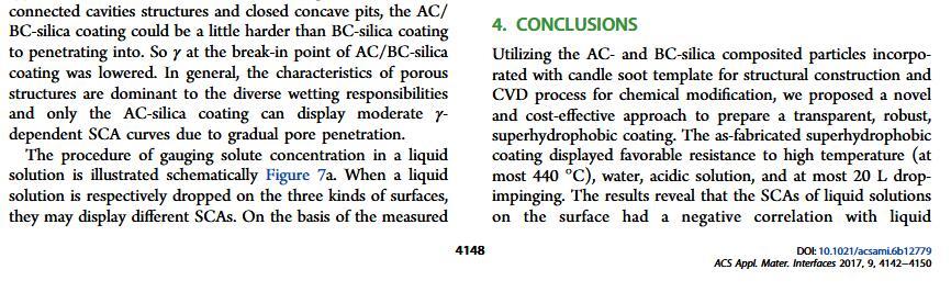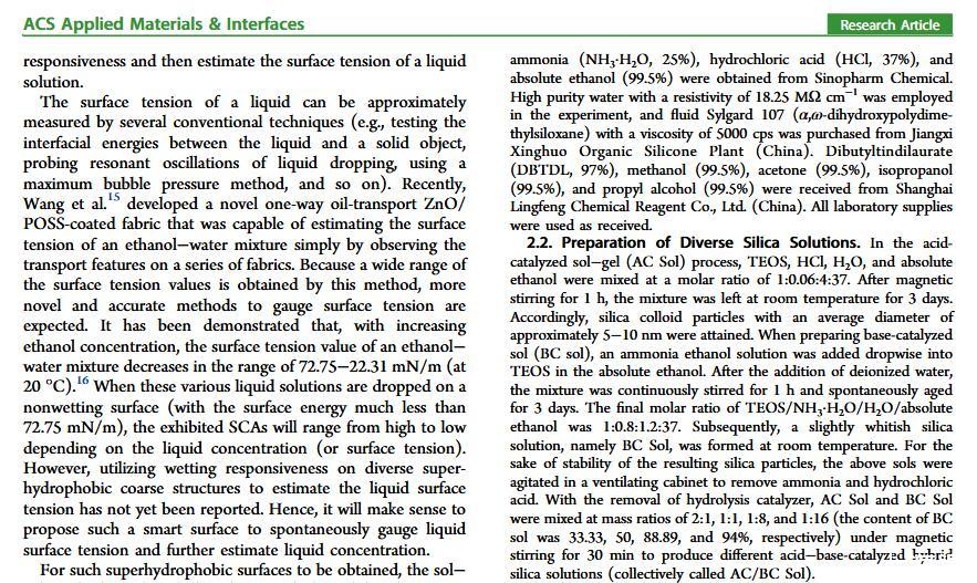 當液體的表面張力發生變化時,它在普通固體表面的潤濕性也會隨著變化。然而,關于這一規律以及尤其是在超疏水表面的表現的研究很少。最近,協同創新中心PI-6管自生老師課題組研究生王研等人利用上述的表面張力和潤濕性的響應關系首次將透明超疏水涂層應用在探測液體表面張力方面,為拓寬多功能超疏水涂層的應用提供了一個新的思路,相關論文已被ACS applied materials&interfaces發表。研究表明,隨著有機物水溶液中有機物體積分數上升,溶液的表面張力相應地下降,溶液液滴在制備的超疏水涂層的接觸角也逐漸下降,此稱之為表面潤濕性對表面張力的響應?;诖隧憫P系,可以通過接觸角估測液體的表面張力以及有機物的濃度。