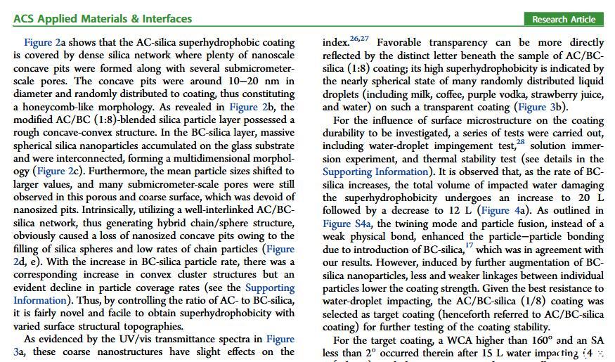 結果表明,以正硅酸四乙酯為前驅體通過酸性和堿性水解法制備了不同形貌的納米二氧化硅溶膠,通過混合兩種溶膠可制備出具有顆粒間鍵橋強度高的亞微米級凸起和納米級凹坑的結構的涂層。通過控制酸堿催化溶膠混合比例,我們可以制備出具有不同微觀結構的超疏水涂層。結果表明具有不同結構的涂層具有不同的潤濕性-表面張力關系,隨著涂層制備時堿催化溶膠的比重增加,納米級凹坑結構逐漸減少,表面更容易被低表面張力液體侵入,因而接觸角下降更劇烈。并且在有機物水溶液,包括:甲醇、乙醇、正丙醇、異丙醇、乙酸、丙酮、N,N’-二甲基酰胺等,都具有同樣的接觸角和濃度(表面張力)響應規律。