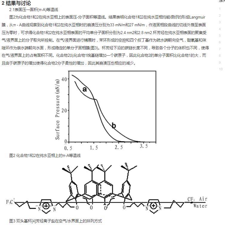 合成了雙頭基多氟烷基兩親杯芳烴化合物1和2,并對該化合物在空氣/水相界面的成膜性能進行了研究,利用表面壓一面積(π-A)等溫線、壓縮/擴張循環等溫線與膜穩曲線,紫外光譜和原子力顯微鏡對組裝的LB膜進行了結構表征,表明化合物1和2在空氣/水相表面均能很好的形成穩定的Langmuir膜,取代基碳原子數的增加使得化合物2的Langmuir膜單分子面積增加,崩潰壓相應減少,組裝的LB膜均為H-聚集體,結構均勻,穩定性好。