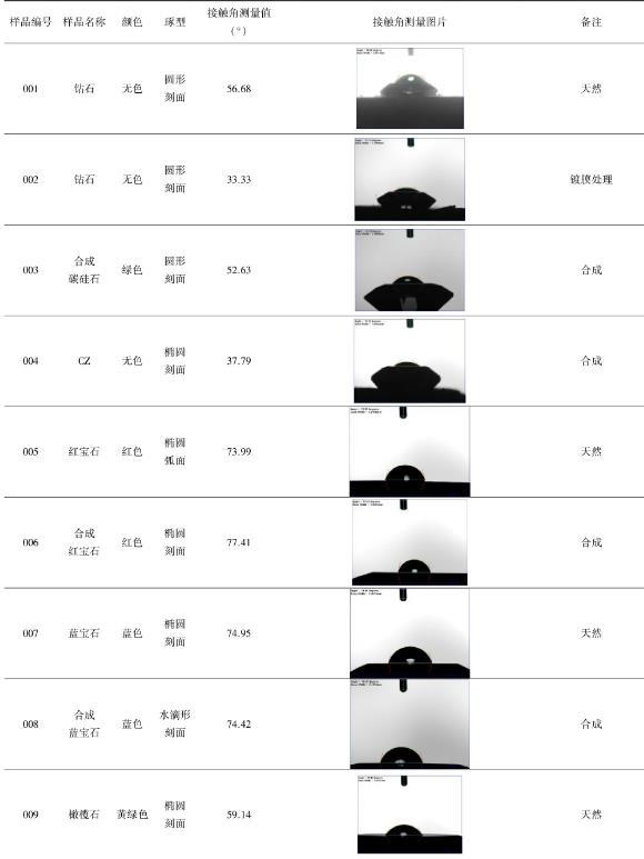 本文運(yùn)用現(xiàn)代儀器(FTA200動(dòng)態(tài)接觸角測(cè)量?jī)x)測(cè)量了15個(gè)天然和合成寶玉石品種(鉆石、合成碳硅石、合成立方氧化鋯、碧璽、托帕石、翡翠、琥珀等),以及經(jīng)覆膜和充填2種處理方法的寶玉石樣品(鍍膜鉆石、覆膜托帕石、覆膜翡翠、覆膜琥珀、充填碧璽)的表面接觸角,并運(yùn)用公式計(jì)算其表面張力。
