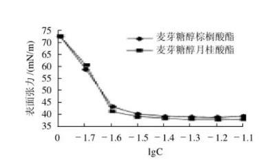 麥芽糖醇脂肪酸酯對(duì)水溶液的表明張力降低明顯。當(dāng)麥芽糖醇脂肪酸酯水溶液質(zhì)量分?jǐn)?shù)0.04%時(shí),就可以使水溶液的表明張力降低30mN/m。當(dāng)麥芽糖醇脂肪酸酯水溶液的質(zhì)量分?jǐn)?shù)為0.06%時(shí),可以使水溶液的表明張力降低至38~40mN/m,與蔗糖脂肪酸酯(30~46mN/m)相近,說(shuō)明麥芽糖醇脂肪酸酯具有較好的表面活性作用。
