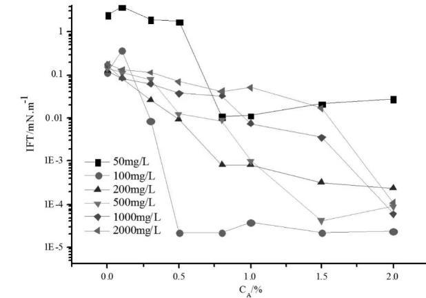 在總濃度為500-1000mg/L范圍內,CDEA-12與CDEA-14按比例9:1,8:2,7:3,6:4,5:5,4:6,3:7,2:8,1:9比例復配[4-5],測定油水界面張力。