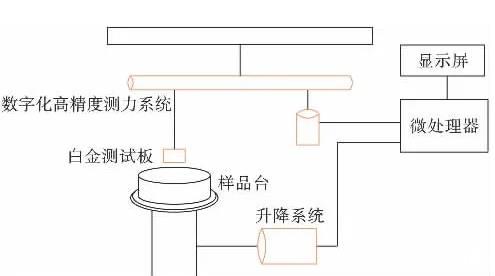 圖1為表面張力儀工作系統(tǒng)示意圖。硬件方面主要包括樣品臺、升降系統(tǒng)、數(shù)字化測力系統(tǒng)和微處理器。軟件方面由控制、分析專用軟件經(jīng)過微處理器的一系列運算,將檢測到的微力轉(zhuǎn)化成表面張力值。由LCD數(shù)字顯示屏實時輸出表面張力值,如果需要,可通過RS232接口連接打印機,打印數(shù)據(jù)或經(jīng)計算機采集相應(yīng)數(shù)據(jù)。該裝置結(jié)構(gòu)簡單,操作簡便,準確性高。