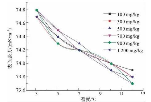 圖7為100、300、500、700、900、1 200 mg/kg濃度下,本實驗自行合成的離子液體[HMIPS]Ss溶液的表面張力隨溫度變化示意圖。在低溫區(qū)間內(nèi)300 mg/kg溶液的表面張力曲線最低,說明該濃度的溶液表面活性最強。在所測溫度范圍內(nèi),整體上表面張力曲線遵循隨溫度升高而表面張力降低的一般規(guī)律,但相差不大,同一條曲線3℃和12℃表面張力值相差0.9~1.1 mN/m。