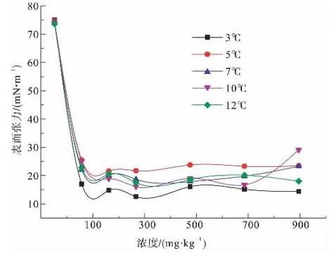 圖2為3、5、7、10、12℃下,陰離子表面活性劑CTAB溶液的表面張力隨濃度變化示意圖。由圖2可知,CTAB是比較優(yōu)良的表面活性劑,在低濃度下就能夠顯著降低溶液表面張力,在300 mg/kg-1時表面張力達到最低值,之后隨濃度增大,表面張力變化不大,因此CTAB的臨界膠束濃度CMC即在此濃度范圍附近。在所測溫度范圍內(nèi),當CTAB溶液達到CMC以后,表面張力值在14.5~23.5 mN/m之間。隨溫度變化,表面張力值相差較大。