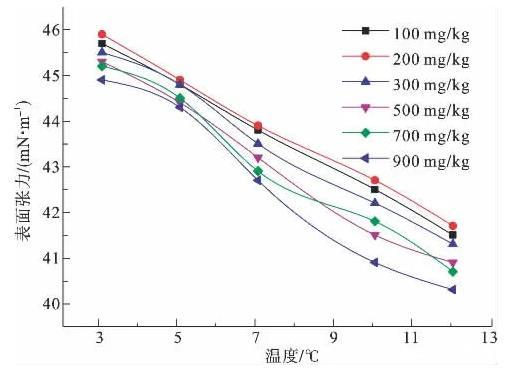 圖6為100、200、300、500、700、900 mg/kg濃度下,非離子表面活性劑P123溶液的表面張力隨溫度變化示意圖。由圖6可知,隨濃度增大,溶液降低表面張力的能力逐漸增大,但各個濃度曲線差值不大,900 mg/kg濃度溶液表面活性最強。在所測溫度范圍內(nèi),整體上表面張力曲線幾乎呈直線狀,遵循隨溫度升高而表面張力降低的一般規(guī)律,斜率幾乎不變,未出現(xiàn)拐點,且相差較大,同一條曲線3℃和12℃表面張力值相差4.2~4.6 mN/m。